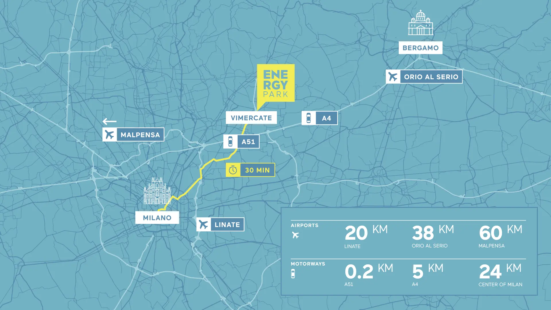 Located in Brianza, at the heart of Lombardy’s technology district, Energy Park offers easy access from Milan (20 km) and other major industrial centres, including Agrate, Vimercate, Cernusco, and Monza. Standing close to the A4 motorway and Milan’s Eastern bypass, as well as the main airports of Northern Italy, it is an ideal location for companies seeking connected, modern office spaces nestled in nature.